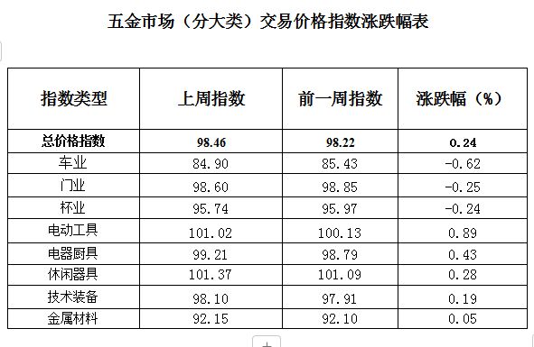 据监测,“世界·永康五金指数”五金市场交易周价格总指数上周(2025年9月22日至2025年9月28日)收于98.46点,较前一周小幅上升0.24个百分点。