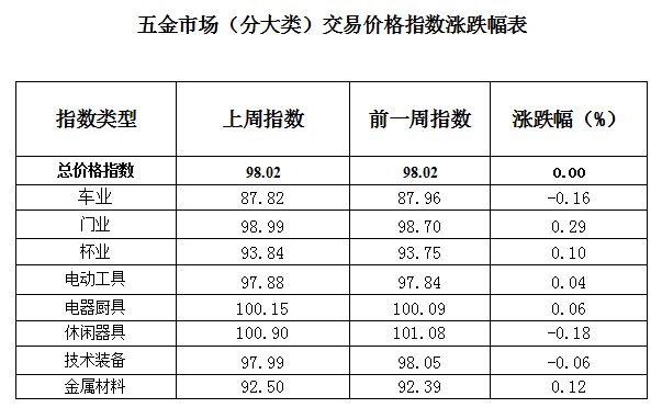 据监测,“世界·永康五金指数”五金市场交易周价格总指数上周(2025年11月3日至2025年11月9日)收于98.02点,与前一周基本持平。