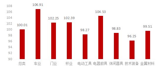 截至2026年1月,永康五金外贸价格指数收于100.01点,环比下降0.07个百分点。与2025年12月相比,车业、杯业和电器厨具行业环比上涨,其中,杯业涨幅最大,环比上涨4.56个百分点;门业、电动工具、休闲器具、技术装备和金属材料行业环比下跌,五金八大行业呈“三升五降”格局。