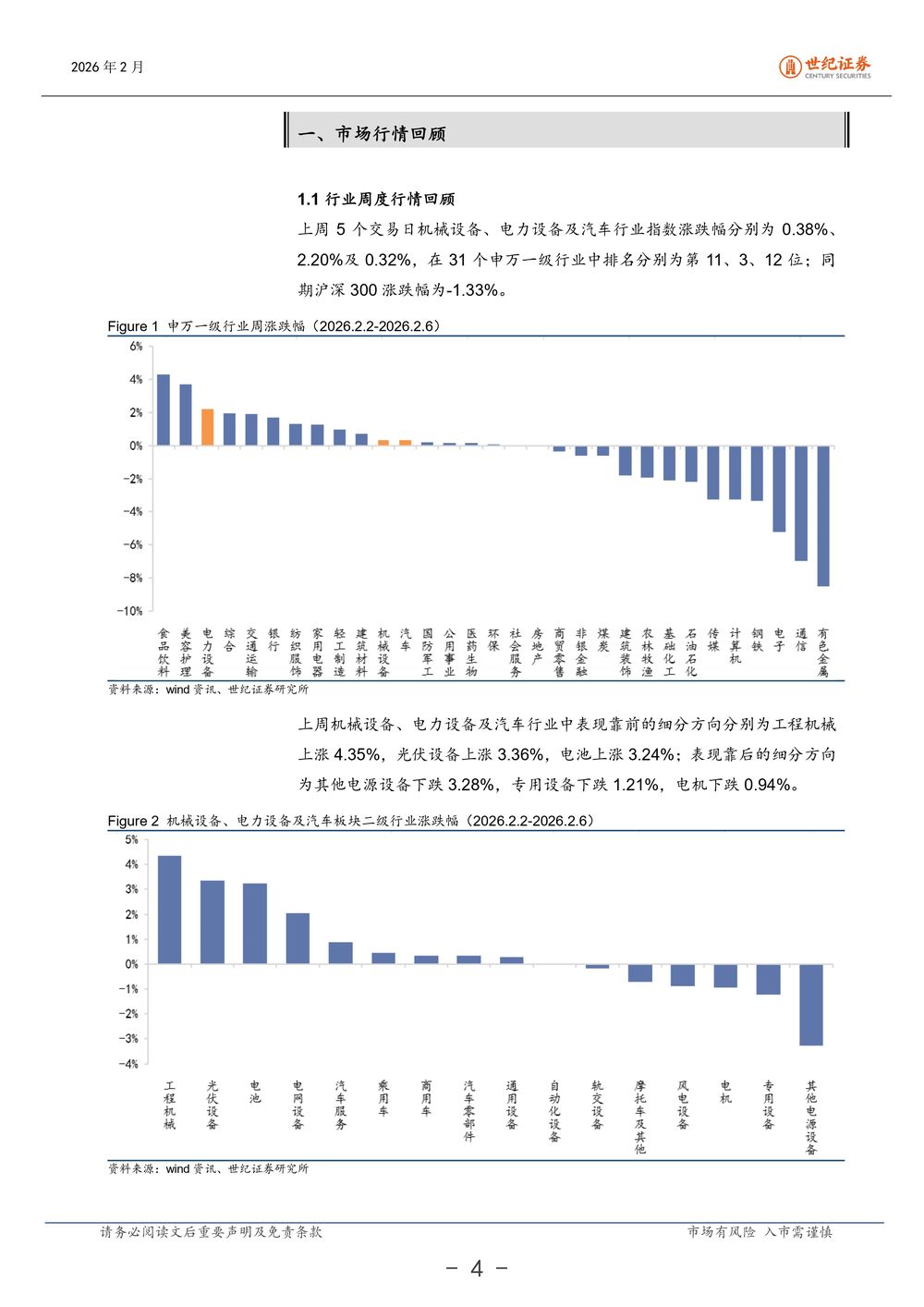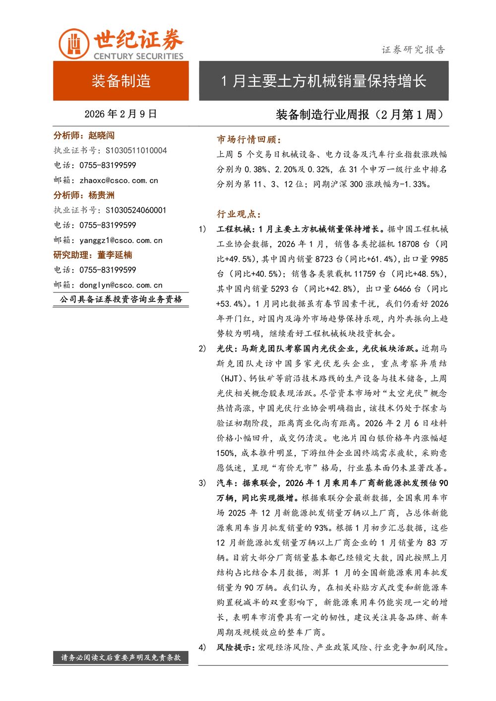【世纪证券】装备制造行业周报:1月主要土方机械销量保持增长