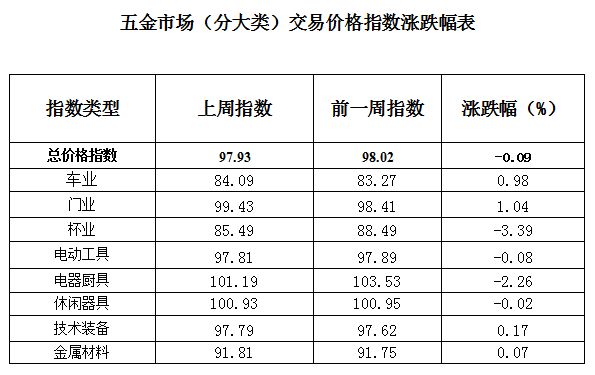 据监测,“世界·永康五金指数”五金市场交易周价格总指数上周(2026年2月2日至2026年2月8日)收于97.93点,较前一周微幅下跌0.09个百分点。