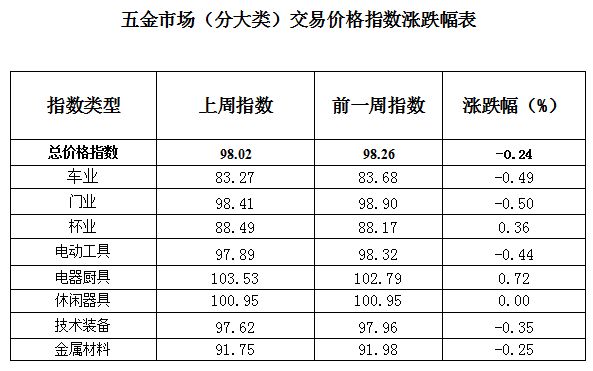 据监测,“世界·永康五金指数”五金市场交易周价格总指数上周(2026年1月26日至2026年2月1日)收于98.02点,较前一周小幅下跌0.24个百分点。