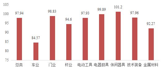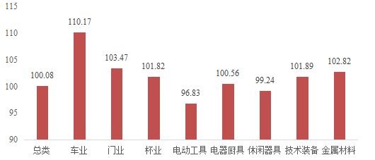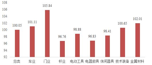 截至2025年10月,永康五金外贸价格指数收于100.08点,环比下降0.04个百分点。与9月相比,车业、杯业、休闲器具和技术装备行业环比上涨,其中,车业涨幅最大,环比上涨7.26个百分点;门业、电动工具、电器厨具和金属材料行业环比下跌,五金八大行业呈“四升四降”格局。