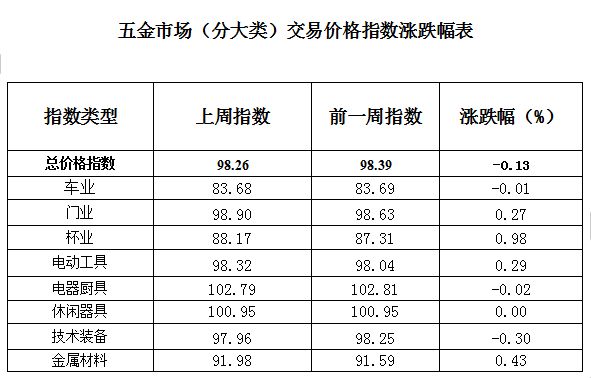 据监测,“世界·永康五金指数”五金市场交易周价格总指数上周(2026年1月19日至2026年1月25日)收于98.26点,较前一周小幅下跌0.13个百分点。